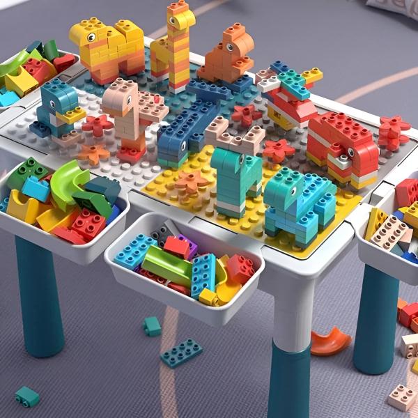 Масата може да се използва и от двете страни, като едната е предназначена за сглобяване на блокчета, а другата е с плоска повърхност.