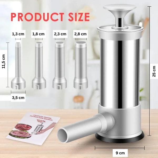 Този уред за пълнене на колбаси може да побере до 1 кг месо наведнъж, а размерът на цевта е 25 x 9 см.