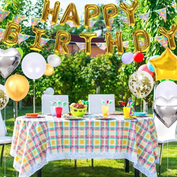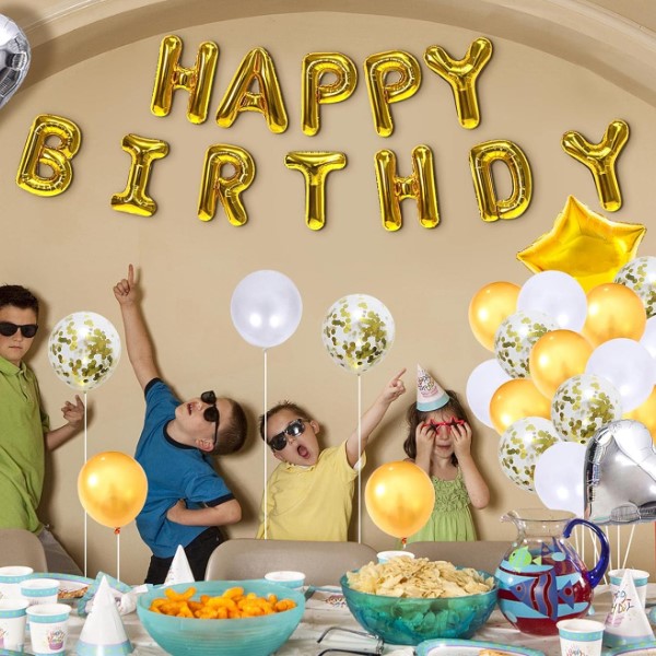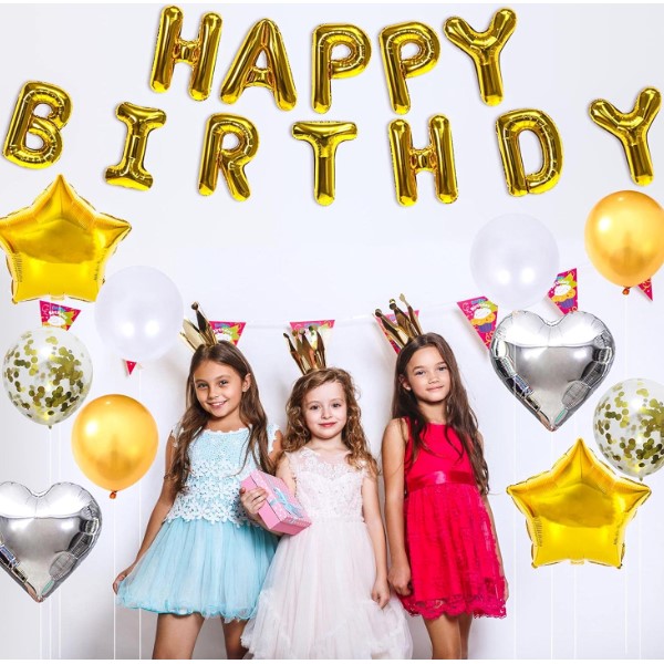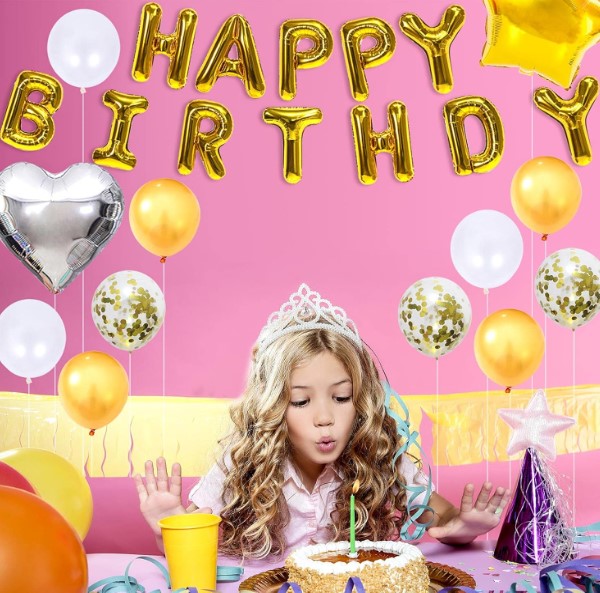 60 балона в различни цветове; 1x балон с форма на корона; 2x балона с форма на петолъчна звезда; 2x балона с форма на четирилъчна звезда; 1x завеса от блестящи панделки; 1x банер „Честит рожден ден“; 5x комплект цветни декоративни пискюли; 1x декорация за торта „Честит рожден ден“; декоративна панделка, аксесоари за връзване на балони, лепило и лента за закрепване на балони.