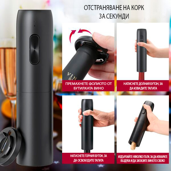 🍷 Отваря всяка бутилка с коркова тапа за 7 секунди – с едно натискане на бутон