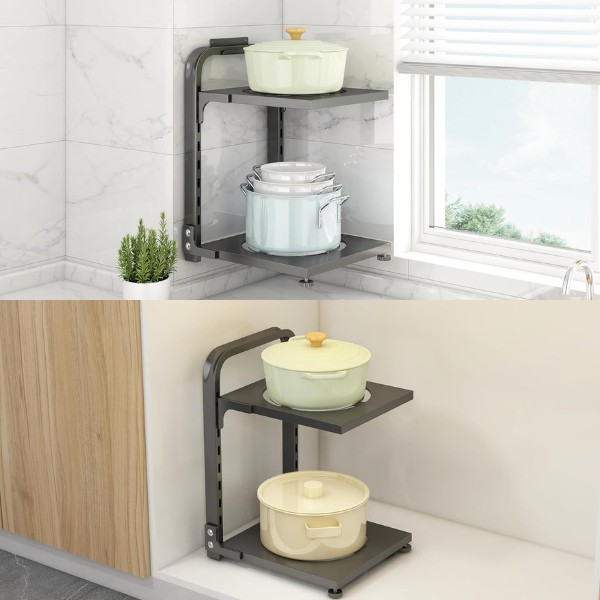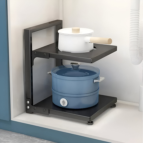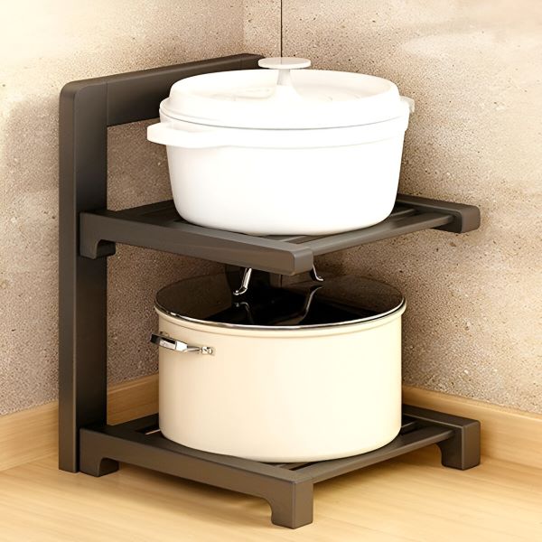 Този стелаж използва ефективно пространството в кухненските шкафове, като подобрява организацията и функционалността на кухнята.