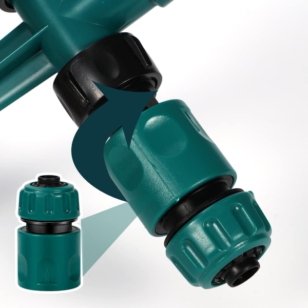 С двойните дюзи за маркуч за вода на ROTOSPRITZ можете без усилие да свържете няколко пръскачки, за да покриете по-големи площи. Просто свържете два или повече уреда ROTOSPRITZ заедно за двустранно напояване, като гарантирате, че цялата ви градина ще получи идеалното количество вода. Това безпроблемно свързване го прави идеален за обширни тревни площи и обширни градински лехи.